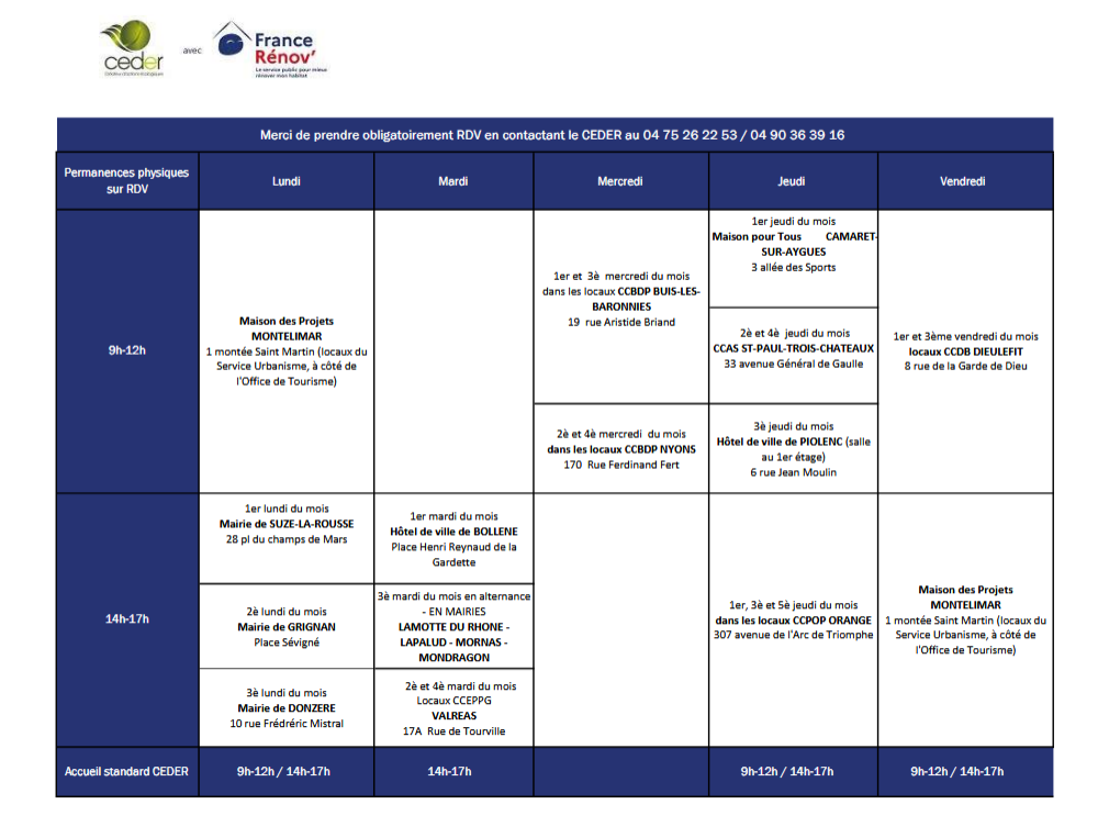 Permanences du CEDER Espace Conseil France Rénov’ en Drôme et Vaucluse. Les entretiens se font sur rendez-vous uniquement : 04 75 26 22 53 / 04 90 36 39 16