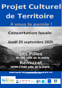 Roland PEYRON, Vice-Président de la CCBDP en charge du PCT, Philippe LEDESERT maire des Pilles, Olivier SALIN maire et Chantal AUBERY conseillère municipale de Rémuzat, vous invitent à participer à ces évènements culturels.