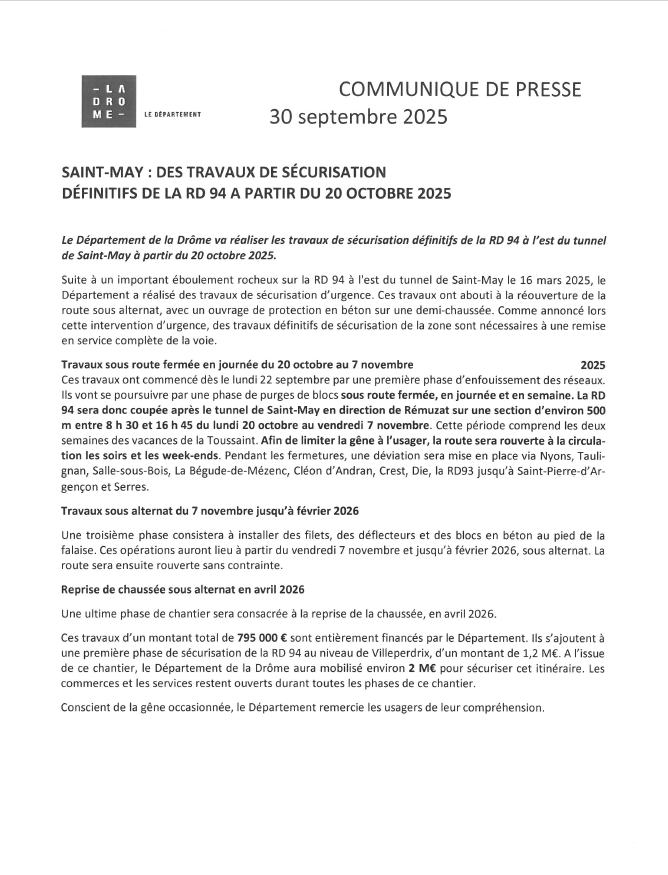 Vous trouverez ci-dessous un communiqué de presse du Département de la Drôme précisant les dates de réouverture des routes départementales 94 et 173.